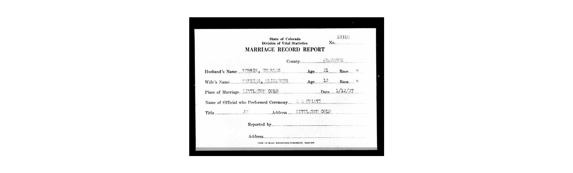 - Right before a massive snowstorm in January 1927 the pair married in Littleton and drove up to the Morris ranch in Pine and were snowed in for months. Elizabeth was only 16, but the marriage certificate listed her as 18.