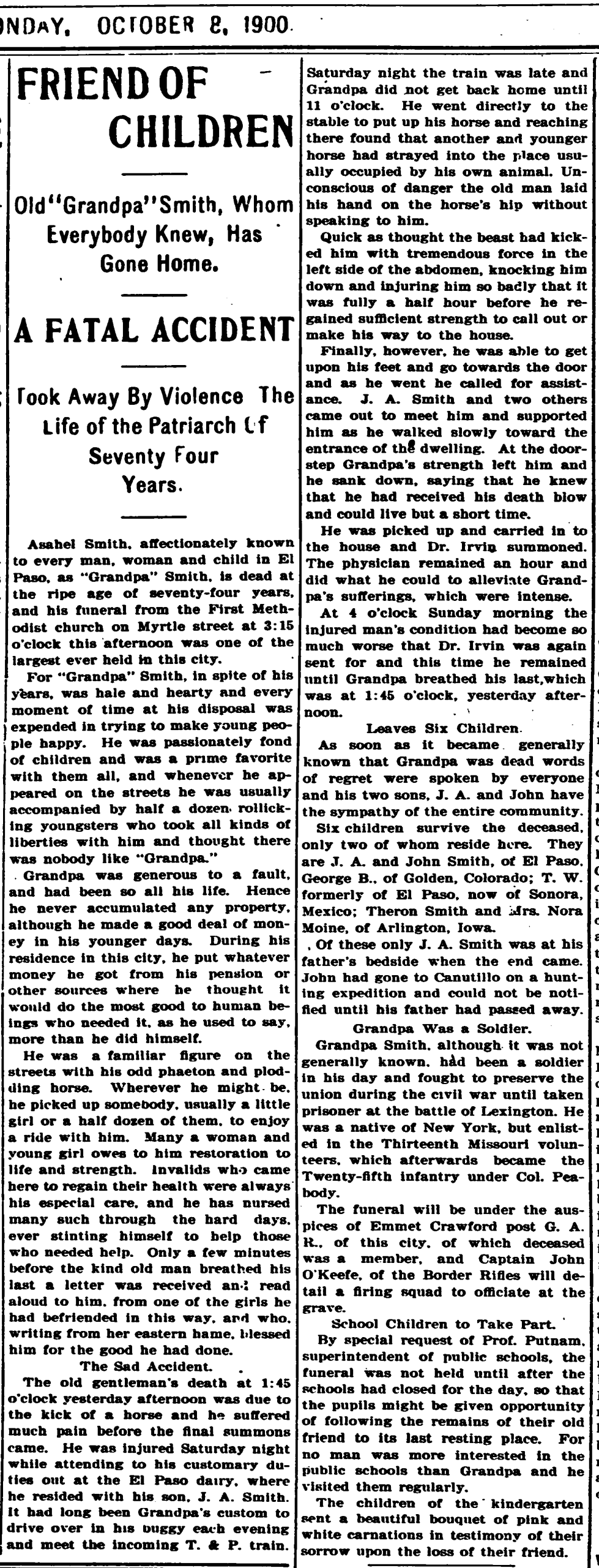 - His obituary said: “Asahel Smith was affectionately know to every man, woman, and child in El Paso as “Grandpa Smith”. Grandpa was generous to a fault. He used the money that he got from his pension or other sources where he thought it would do the most good to human beings who needed it. He was a familiar figure on the streets with his odd phaeton (a light, open, four-wheeled carriage) and plodding horse. Wherever he might be, he picked up somebody to enjoy a ride with him.”