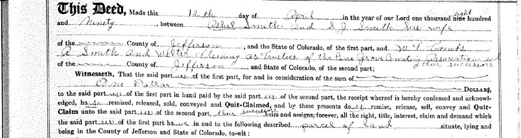 A few years later, Asahel filed for a 160 acre homestead (formally known as a Land Patent) and it was issued to him on June 30, 1886. With the land secured as theirs, Asahel and Sarah carved out a portion of their property on April 12, 1890 to be a cemetery. They deeded 1.5 acres for $1, forming the Pine Grove Cemetery Association. The trustees were all fellow homesteaders – Asahel Smith, William Combs and Walter Fleming – and the document was notarized by Charles Dake, the founder of Pine Grove. An eternal resting place was now established for their neighbors and fellow pioneers.